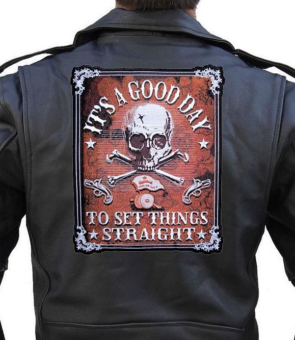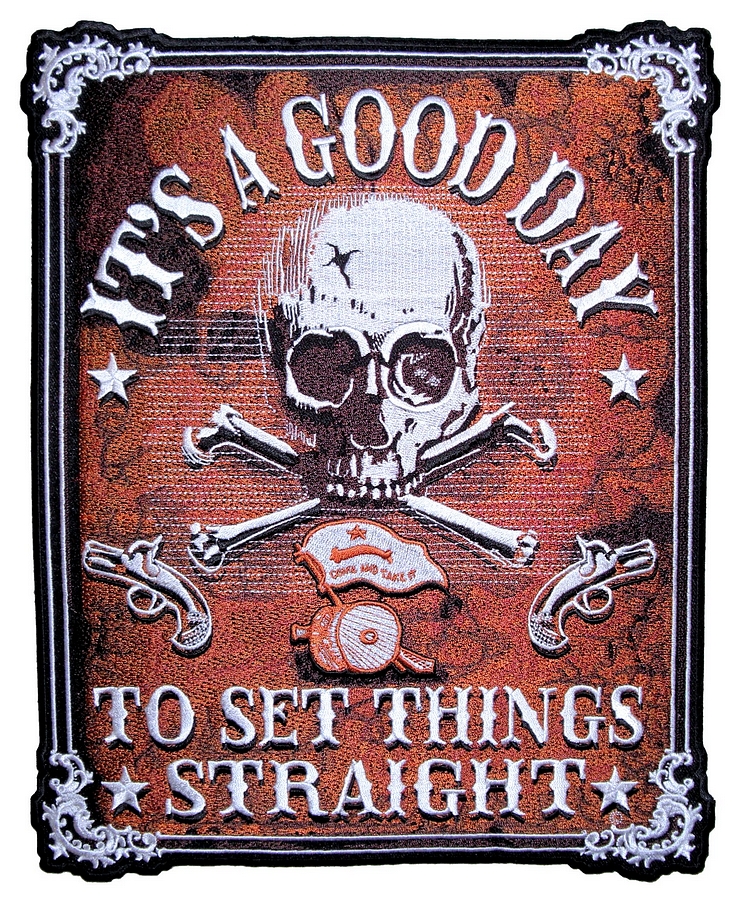 I’m happy and proud to be able to offer this great looking and unique biker patch. It features a white skull with cross bones, pistols and cannon with the words “IT’S A GOOD DAY TO SET THINGS STRAIGHT” on a rustic brown background. It is a great patch with lots of detail. Can be sewn or ironed on. Great for leather or textile jackets, vest, hats, caps, whatever you can think of. A great looking patch that is hard to find. I have this in two sizes:
