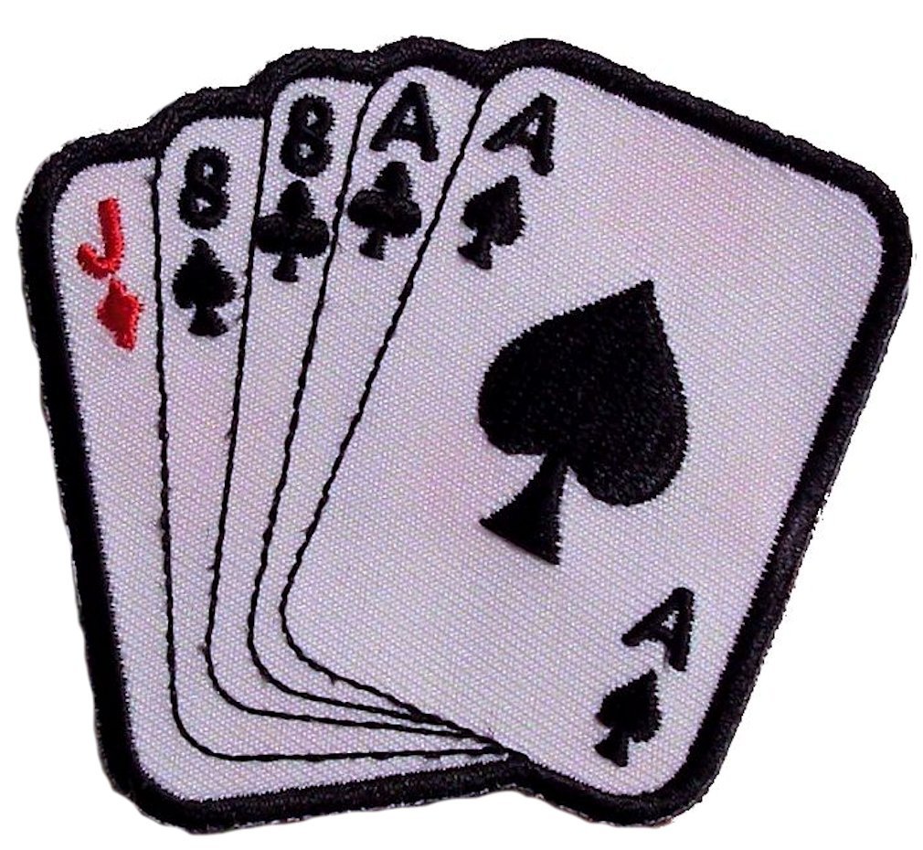 This cool looking biker patch is top quality made. Features a hand of Aces and Eights playing cards. Can be sewn or ironed on. Great for leather or textile jackets, vest, hats, caps, whatever you can think of. Measures 3 inches wide by 2.5 inches high. A very cool looking patch.