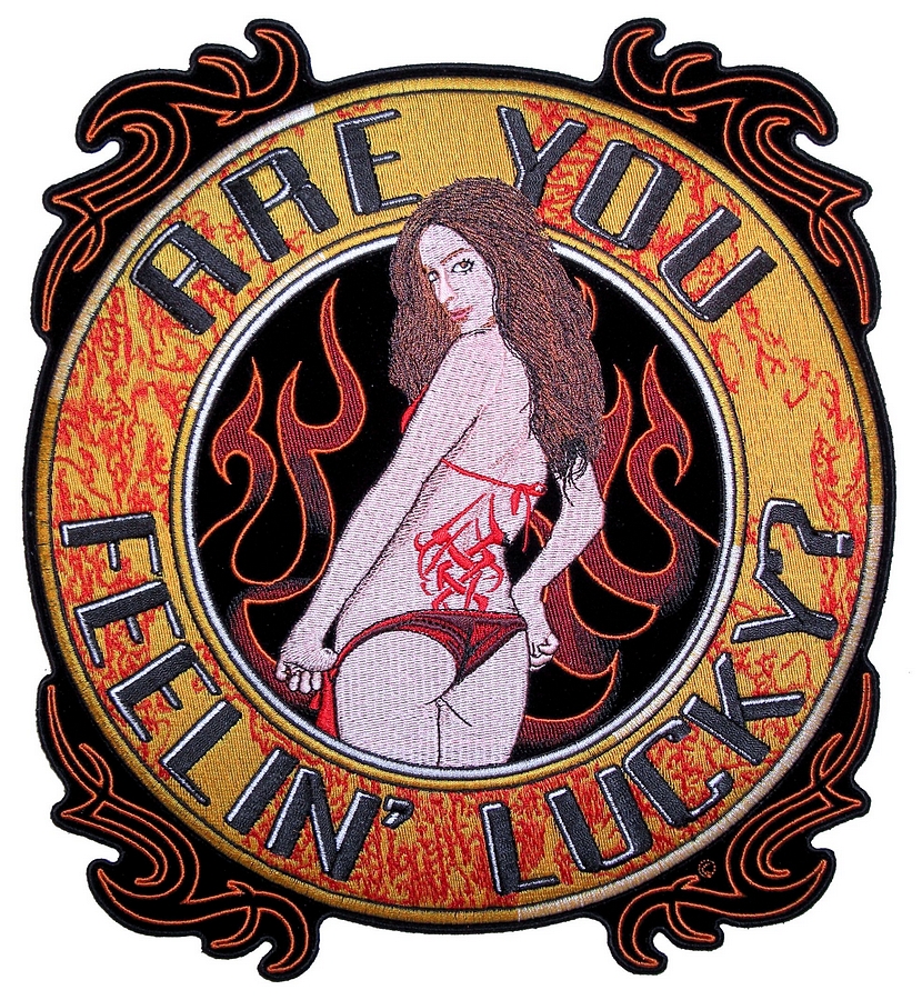 I’m happy and proud to be able to offer this great looking and unique biker patch. Very large, It features a sexy babe in bikini in the center with the words “ARE YOU FEELING LUCKY?” around her with flames. It is a great patch with lots of detail. Can be sewn or ironed on. Great for leather or textile jackets, vest, hats, caps, whatever you can think of. Measures 10 inches wide by 11 inches high. A great looking patch that is hard to find.
