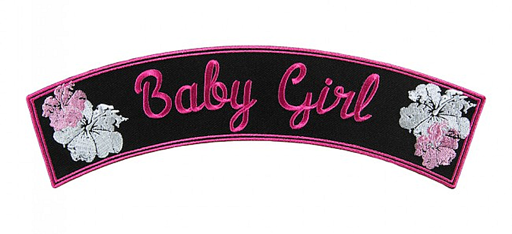 This sexy lady biker patch is top quality made and a new design not found anywhere else. It features the word Baby Girl in hot pink in the center with pink and white flowers with a hot Pink border on a black background. Can be sewn or ironed on. Great for back of jacket, with a matching patch, backpack, anything. Measures 10 inches wide by 3 inches high.