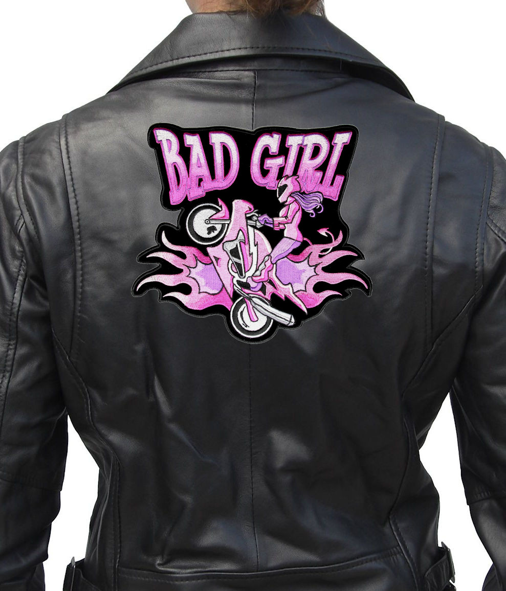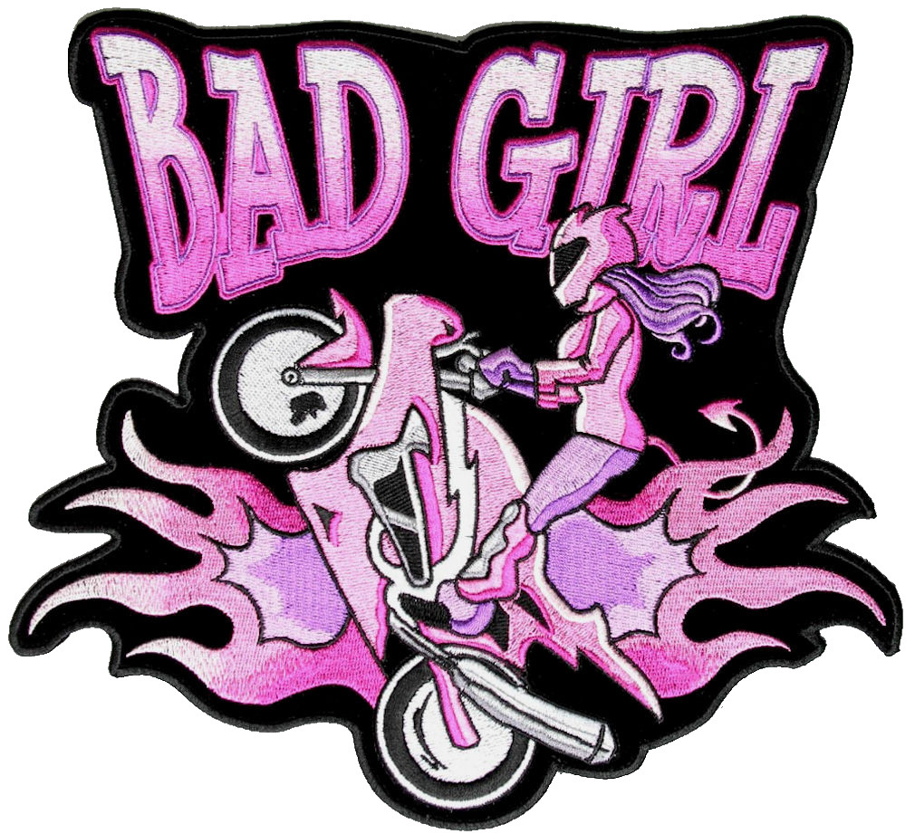 This beautiful looking lady biker patch is top quality made and comes in two sizes. It features a sexy pink biker babe with a devil tail doing a wheeley on a motorcycle with pink flames and “BAD GIRL” at the top. The colors are bright with lots of details. Can be sewn or ironed on. I have this in two sizes: