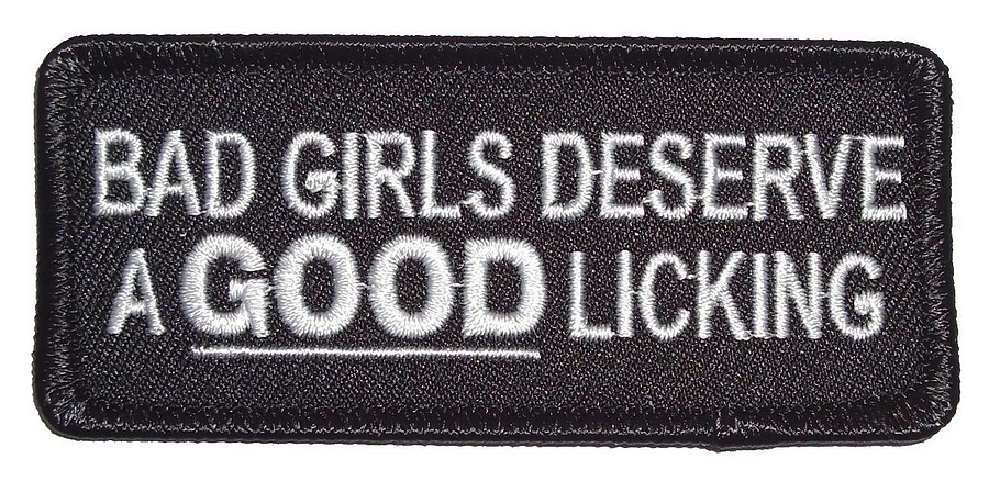 This sexy looking lady biker patch is top quality made. Features “Bad girls deserve a GOOD licking” in white lettering. Can be sewn or ironed on. Great for leather or textile jackets, vest, hats, caps, whatever you can think of. Measures 3 1/2 inches wide by 1 1/2 inches high. A very sexy lady biker patch for a vest or jacket.