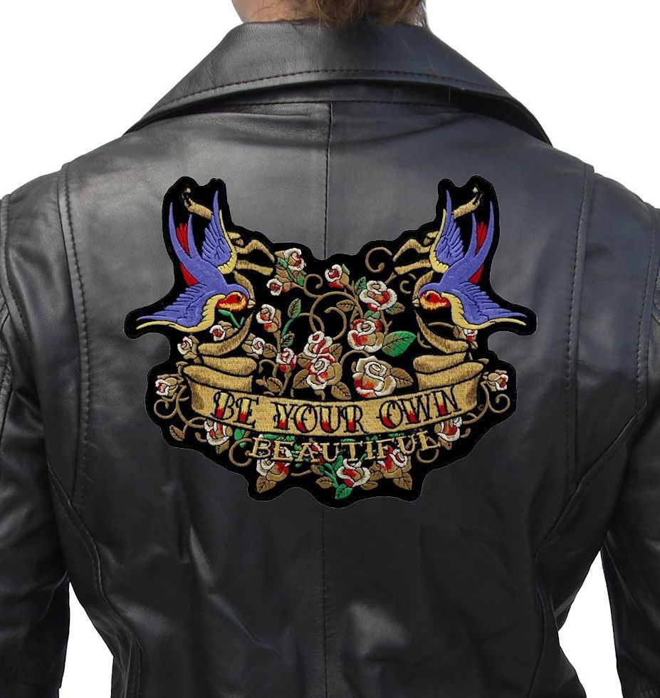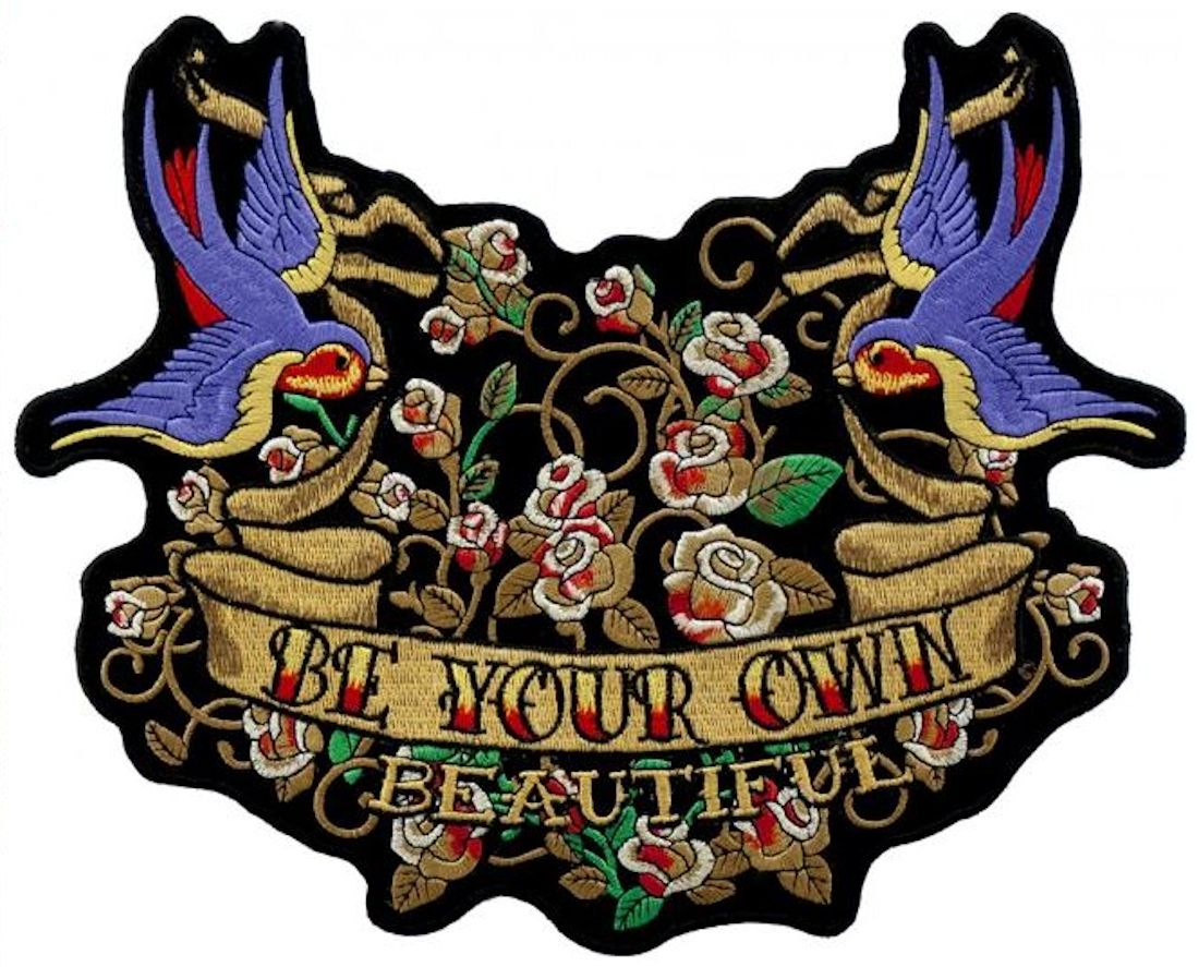 This sexy looking lady biker patch is top quality made. Features two bluebirds, roses and gold banner that says Be Your Own Beautiful in tattoo style writing. Can be sewn or ironed on. Great for leather or textile jackets, vest, hats, caps, whatever you can think of. I have this in two sizes: