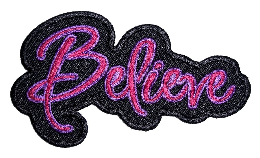 This sexy looking lady biker patch is top quality made. Features “Believe” saying in purple and red lettering on a black background. Can be sewn or ironed on. Great for leather or textile jackets, vest, hats, caps, whatever you can think of. Measures 3.5 inches wide by 2 inches high. A very sexy lady biker patch for a vest or jacket.