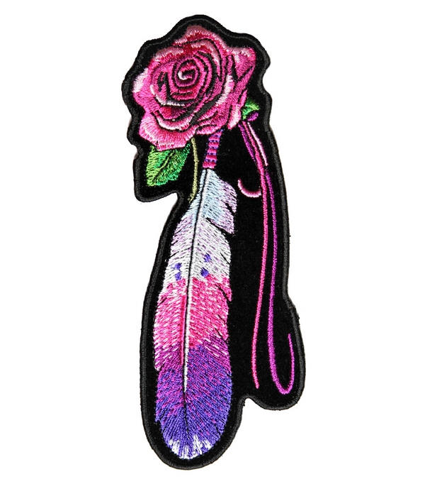 This buy it nowauction is for a beautiful biker patch . It features a beautiful rose with feather and ribbons . It is a very good looking patch, with lots of detail.