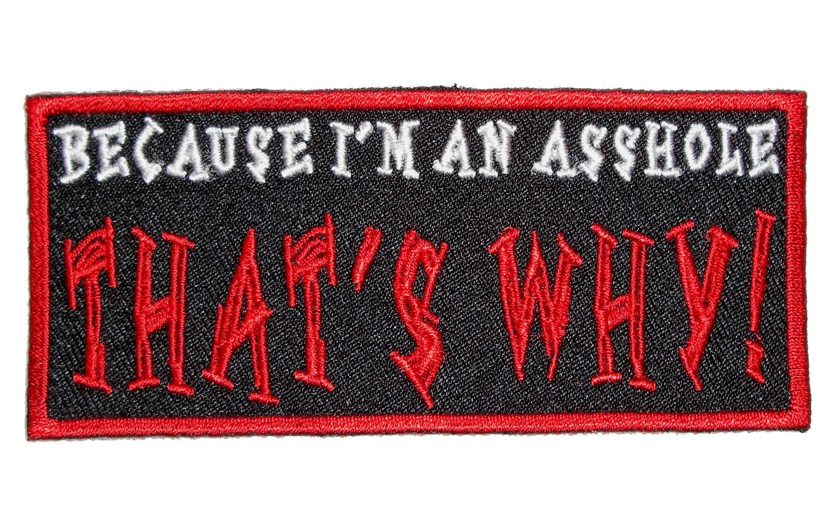This biker patch is top quality made. It features a really cool looking Because I’m An Asshole That’s Why! patch. Can be sewn or ironed on. Great for leather or textile jackets, vest, hats, caps, whatever you can think of. Measures 4 inches wide by 1.5 inches high.
