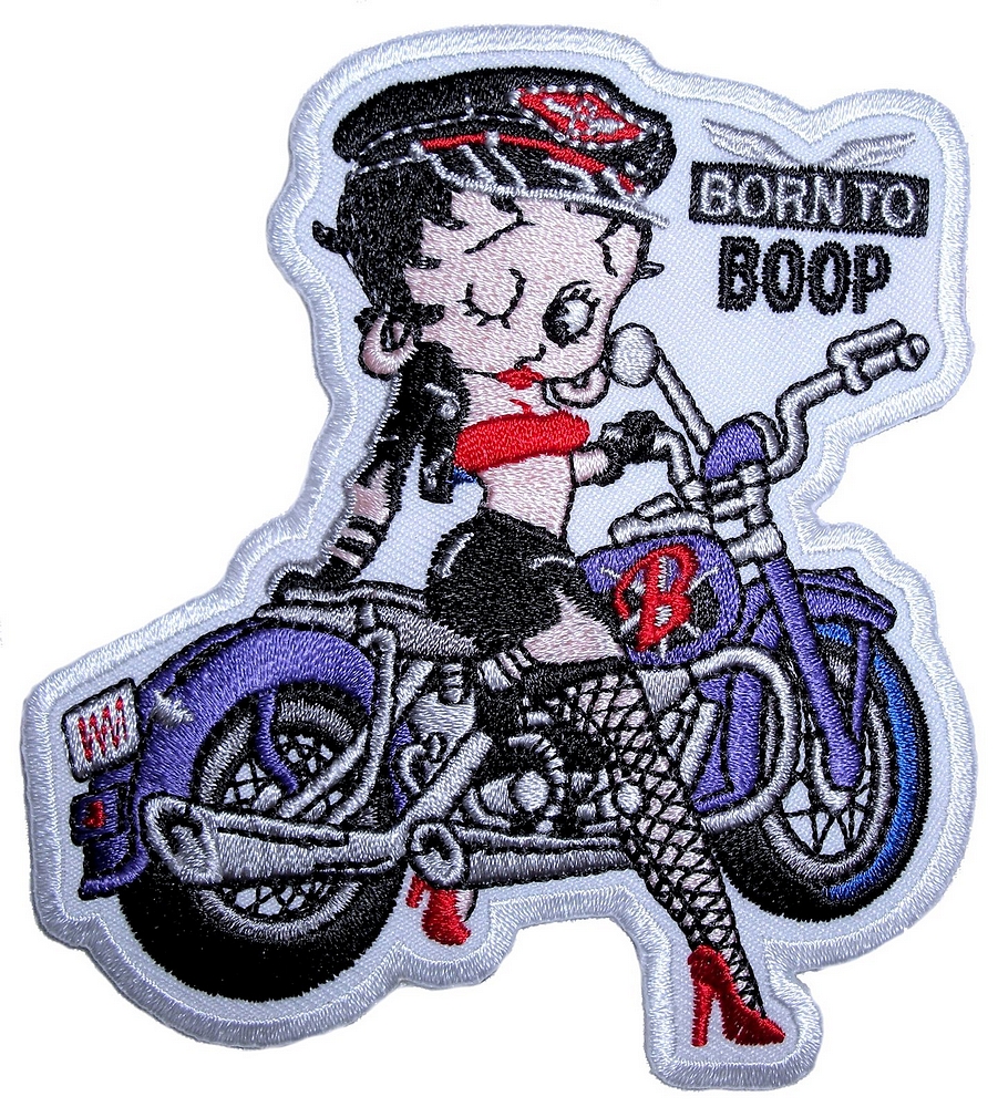 This sexy looking lady biker patch is top quality made. Features Betty Boop as a biker babe in tiny red top, black shorts and biker hat riding a purple motorcycle and the words “Born To Boop”. Can be sewn or ironed on. Great for leather or textile jackets, vest, hats, caps, whatever you can think of. Measures 3.5 inches wide by 4 inches high. A very sexy lady biker patch for a vest or jacket, check out my other patches too.