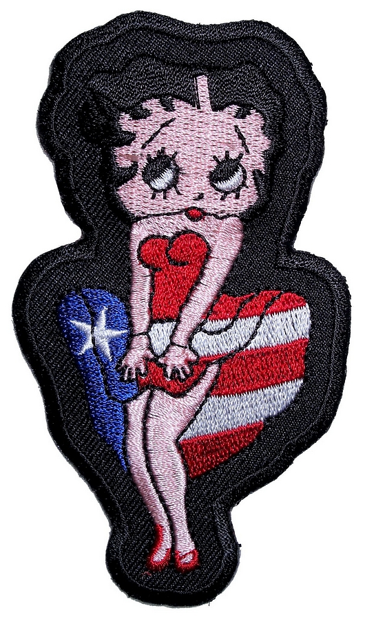This sexy looking lady biker patch is top quality made. Features Betty Boop wearing an American flag dress. Can be sewn or ironed on. Great for leather or textile jackets, vest, hats, caps, whatever you can think of. Measures 2.25 inches wide by 4 inches high. A very sexy lady biker patch for a vest or jacket, check out my other Betty Boop patches too.
