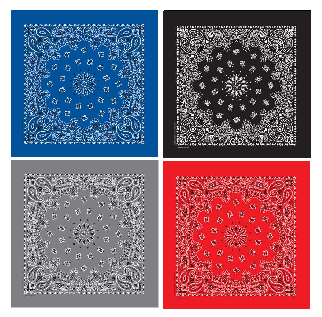 This buy it now au ction is for a pack of four different biker bandanas . You get one of each style for a total of 4. Each measures 22 inches long and high. This set is a classic Paisley theme designs. Made in the USA!