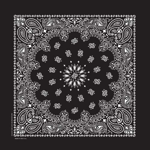 This buy it now au ction is for a four pack of black paisley bandanas . There are a total of 4 of them, all the same design. Each measures 22 inches long and high . Made in the USA!