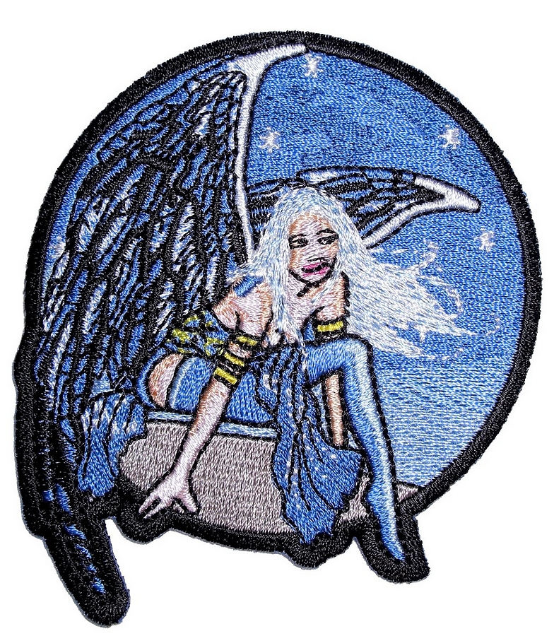 This sexy looking lady biker patch is top quality made. Features a sexy blue winged fairy girl sitting under the night stars. Can be sewn or ironed on. Great for leather or textile jackets, vest, hats, caps, whatever you can think of. Measures 3 inches wide by 3 inches high. A very sexy lady biker patch for a vest or jacket.