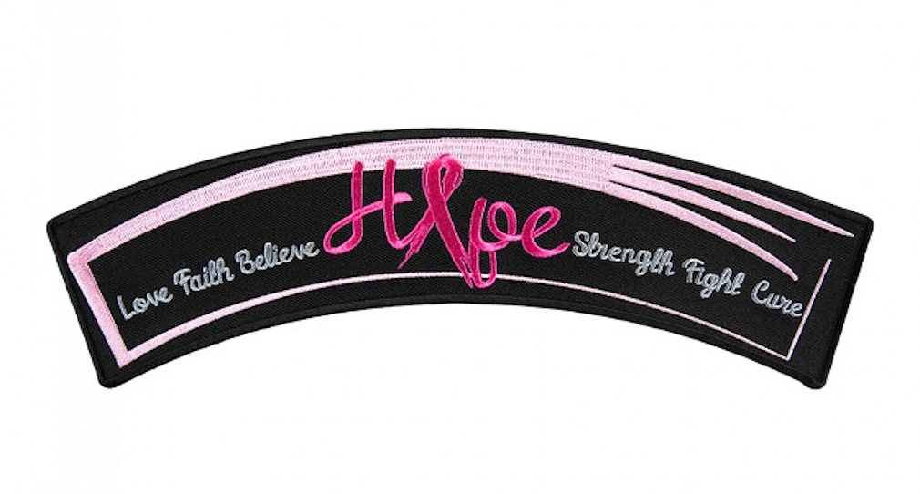 This sexy lady biker patch is top quality made and a new design not found anywhere else. It features the word HOPE in the center with a ribbon, then “Love Faith Believe Strength Fight Cure” in white with a Pink border on a black background. Can be sewn or ironed on. Great for back of jacket, with a matching patch, backpack, anything. Measures 10 inches wide by 3 inches high.