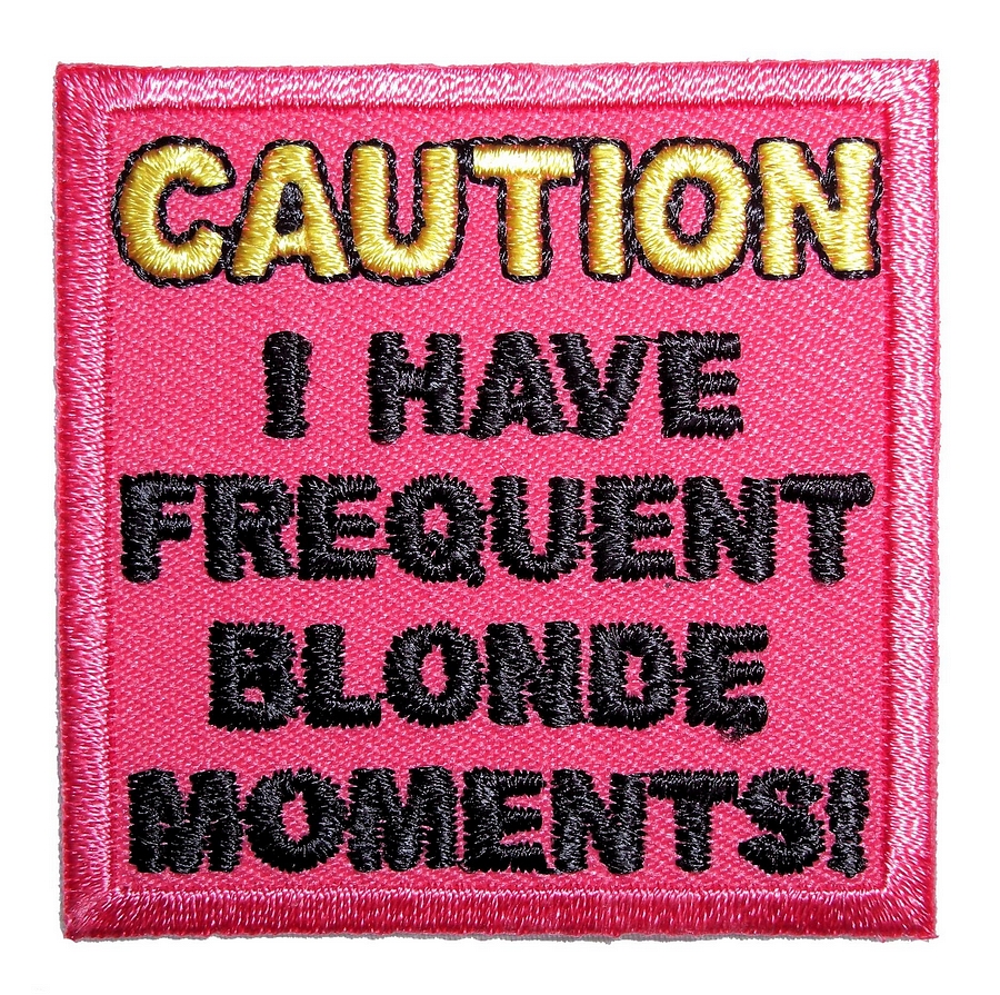 This sexy looking lady biker patch is top quality made. Features the words “CAUTION I HAVE FREQUENT BLONDE MOMENTS!” in black and yellow on a pink background. Can be sewn or ironed on. Great for leather or textile jackets, vest, hats, caps, whatever you can think of. Measures 2 inches wide by 2 inches high. A very sexy lady biker patch for a vest or jacket.