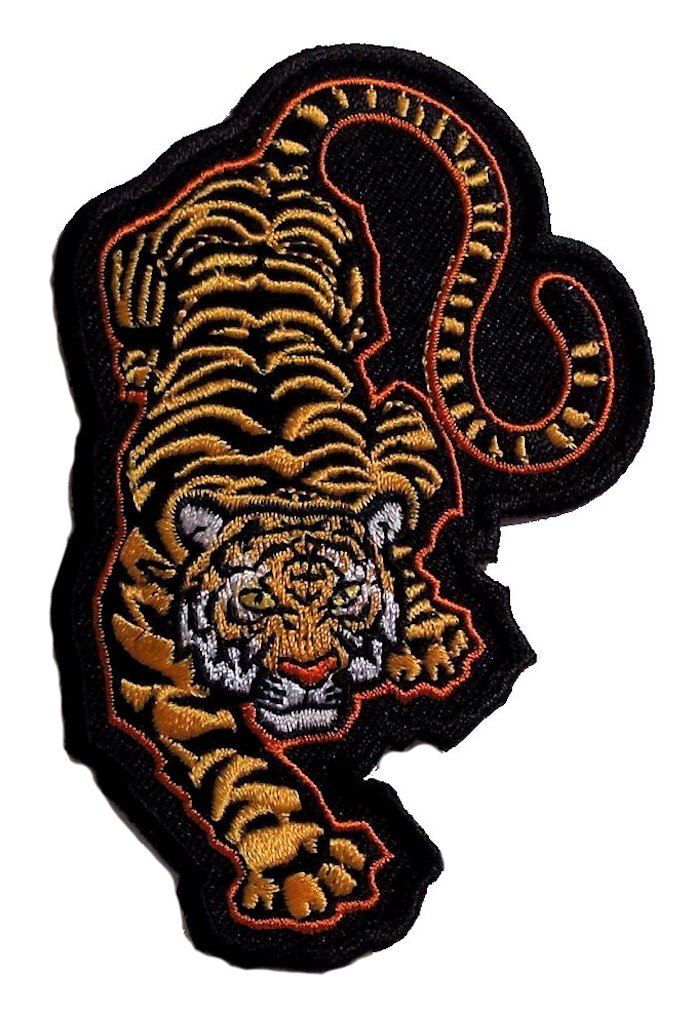 This cool looking biker patch is top quality made. Features an orange crouching tiger. Can be sewn or ironed on. Great for leather or textile jackets, vest, hats, caps, whatever you can think of. Measures 2.5 inches wide by 4 inches high. A very cool looking patch.