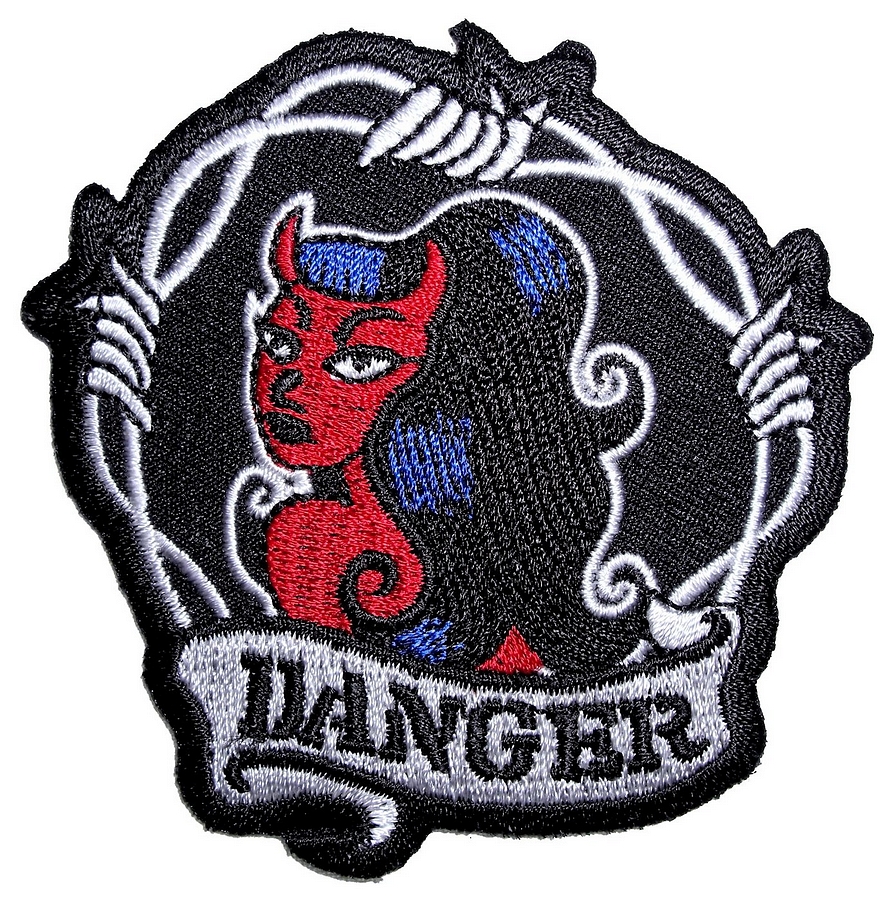 This sexy looking lady biker patch is top quality made. Features a sexy red devil girl with blue hair, barbed wire and DANGER at bottom. Can be sewn or ironed on. Great for leather or textile jackets, vest, hats, caps, whatever you can think of. Measures 3 inches wide by 3 inches high. A very sexy lady biker patch for a vest or jacket.