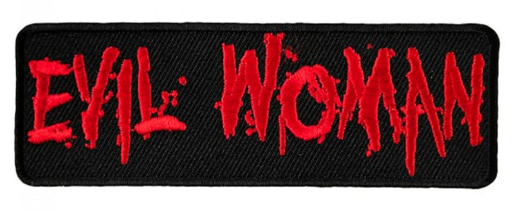 This sexy looking lady biker patch is top quality made. Features the words EVIL WOMAN in crazy red text on a black background. Can be sewn or ironed on. Great for leather or textile jackets, vest, hats, caps, whatever you can think of. Measures 3.75 inches wide by 1.25 inches high.