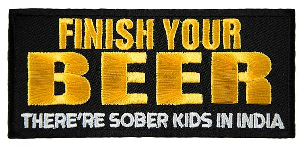 This cool looking biker patch is top quality made and one of my latest designs. It features “Finish Your Beer There’re Sober Kids In India” in white and yellow text on a black background. Can be sewn or ironed on. Great for leather or textile jackets, vest, hats, caps, whatever you can think of. Measures 4 inches wide by 1.75 inches high.
