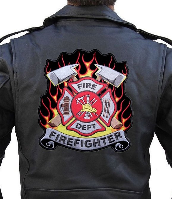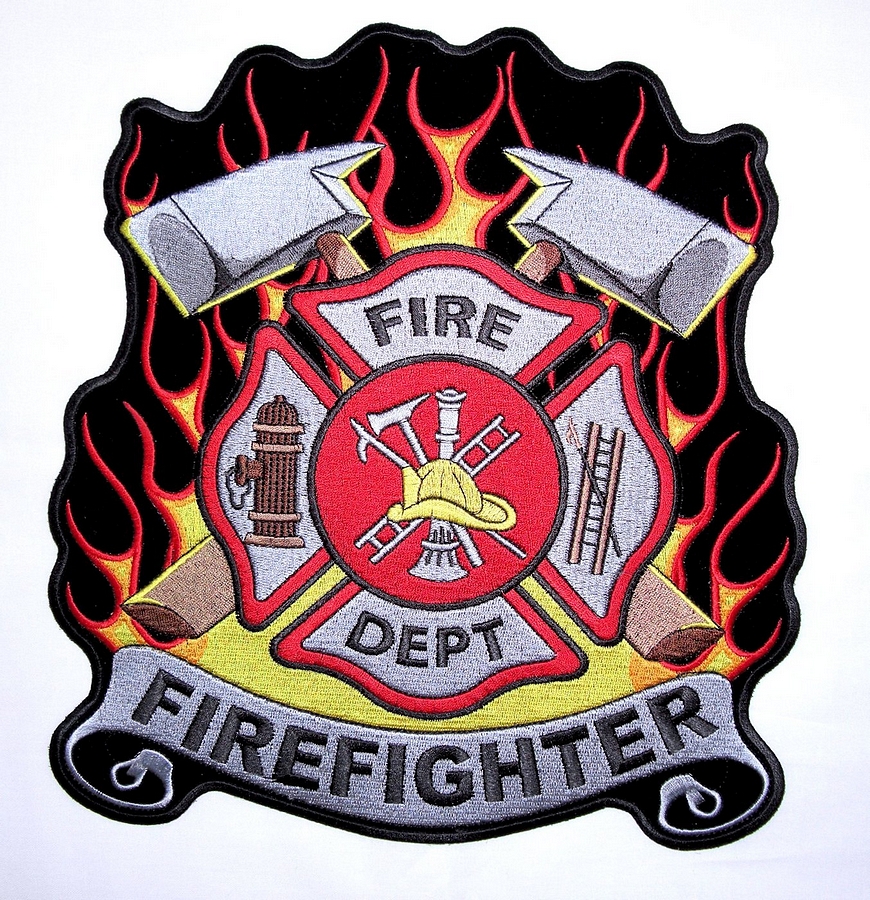 This patch features flames with fire axes, Maltese cross and “FIREFIGHTER” on bottom silver banner. It is a great patch with lots of detail. Can be sewn or ironed on. I have this in two sizes: