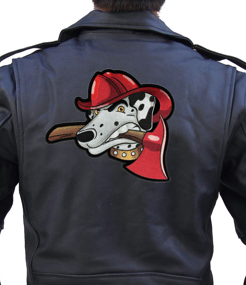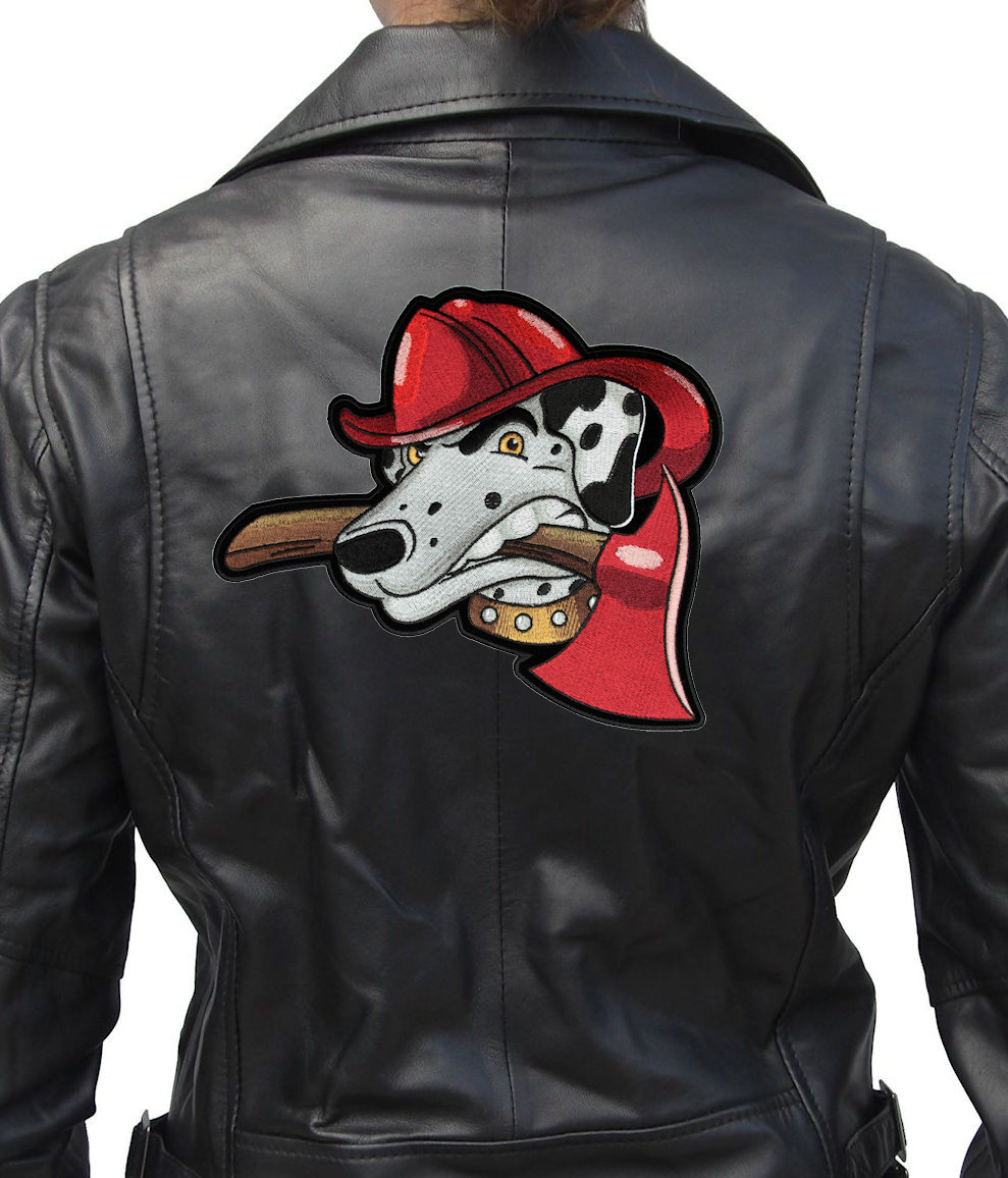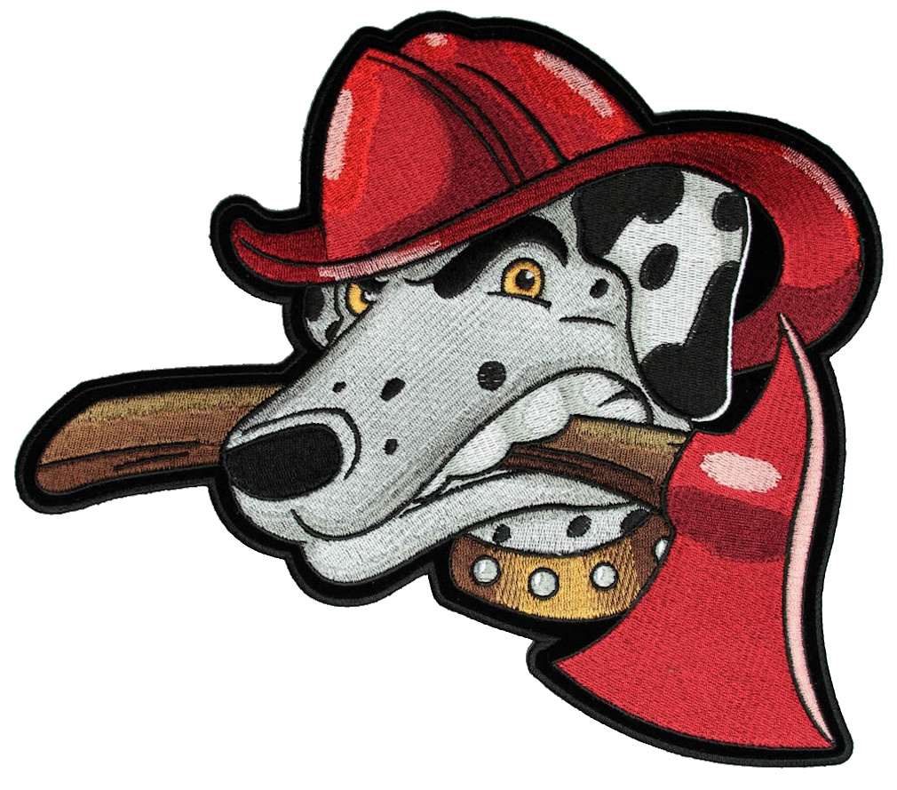 This patriotic looking biker patch is top quality made and comes in two sizes. It features a Dalmatian fireman dog holding a fire axe and wearing a firefighter hat. Can be sewn or ironed on. I have this in two sizes: