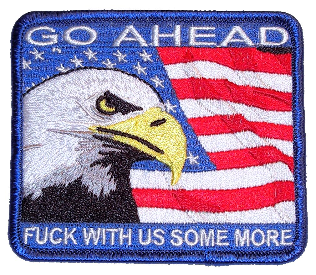 This patriotic looking biker patch is top quality made. Features “Go Ahead Fuck With Us Some More” in white letters with an eagle and American flag on a blue background. Can be sewn or ironed on. Great for leather or textile jackets, vest, hats, caps, whatever you can think of. Measures 3.5 inches wide by 3 inches high.
