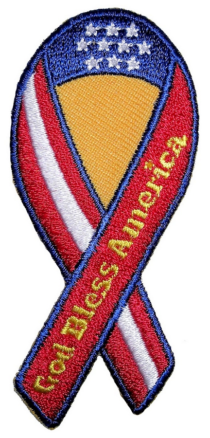 Small biker patch in the shape of a ribbon. Ribbon is red, white, blue and yellow with white stars on it. Also features the words “God Bless America” on it. Can be sewn or ironed on. Smaller size makes it ideal for leather or textile jackets, and vest, hats or caps. Measures 1.25 inches wide by 3 inches high.