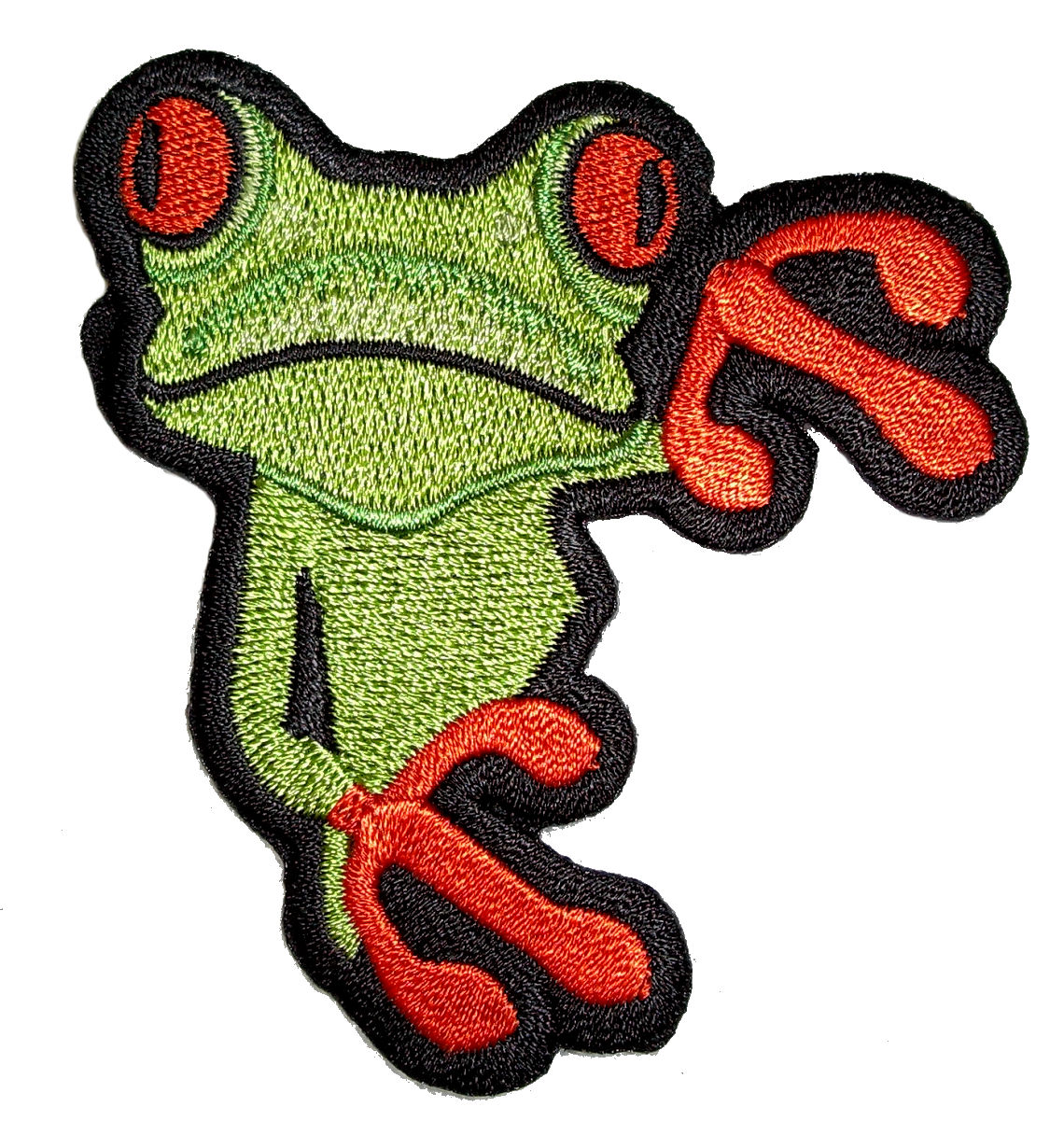 This biker patch is top quality made. It features a really cute looking green and orange tree frog peeking from around a tree. Can be sewn or ironed on. Great for leather or textile jackets, vest, hats, caps, whatever you can think of. Measures 2.5 inches wide by 3 inches high.