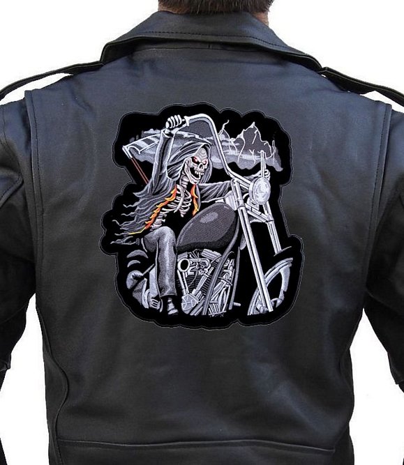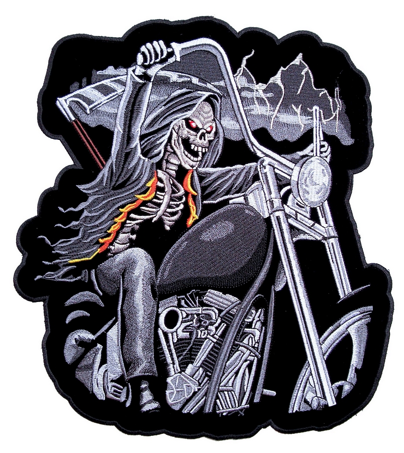 This is one of my latest biker patch designs! It’s very unique looking and a brand new design. It features the Grim Reaper with red eyes and flames riding a motorcycle with lightning in the background. It is a great patch with lots of detail. Can be sewn or ironed on. I have this in two sizes: