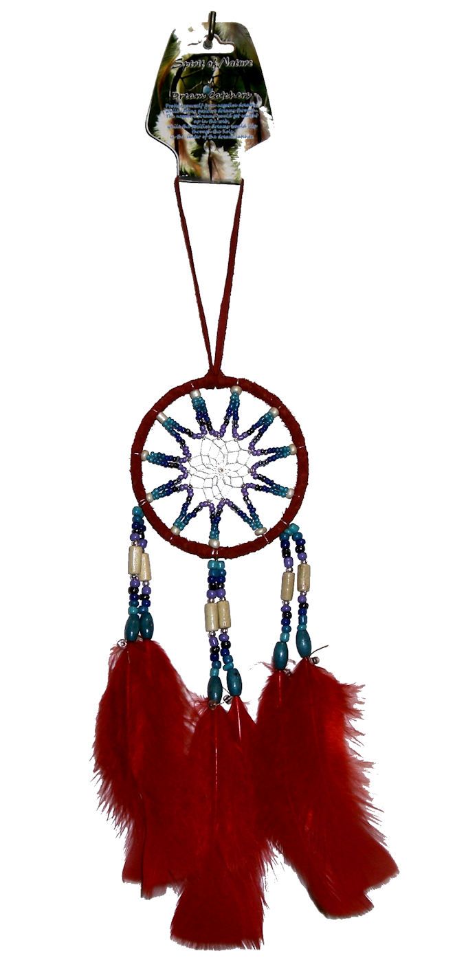 This is a beautiful beaded dreamcatcher ornament with feathers that is handmade by Native Latin American Indians. It is made of beautiful beads and feathers that flow nicely at the bottom. Each dreamcatcher ornament measures approximately 9.5 inches long x 3.25 inches wide.