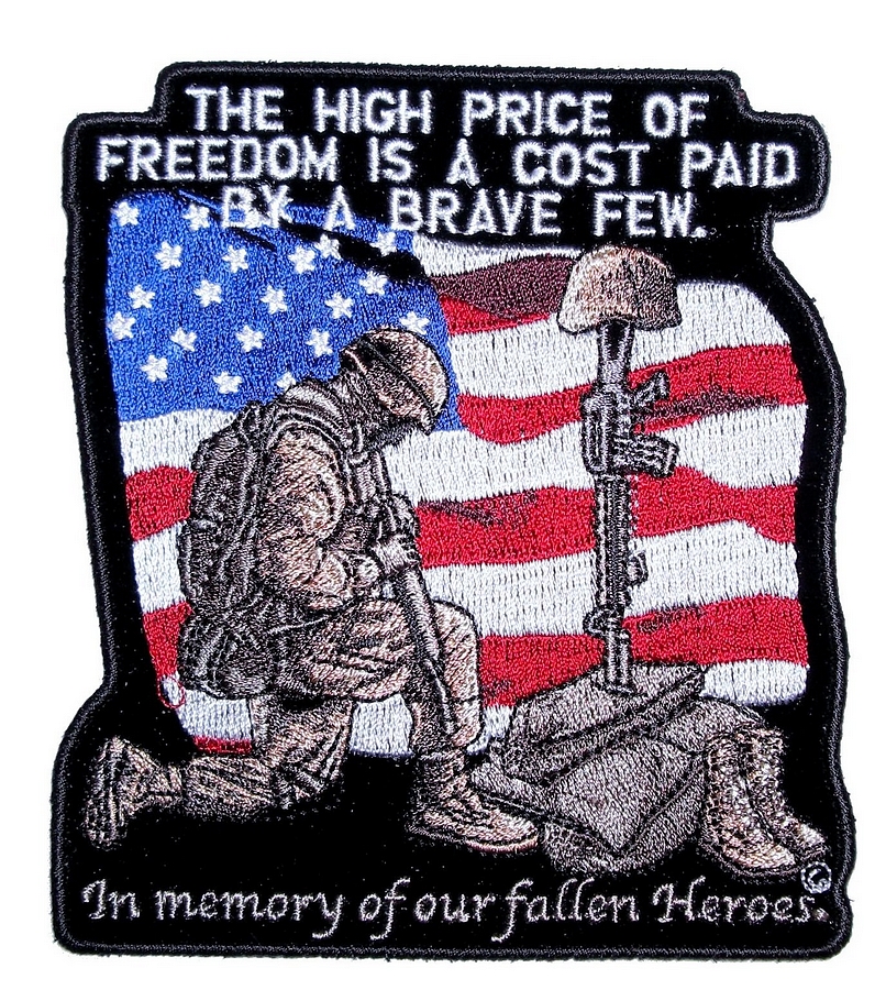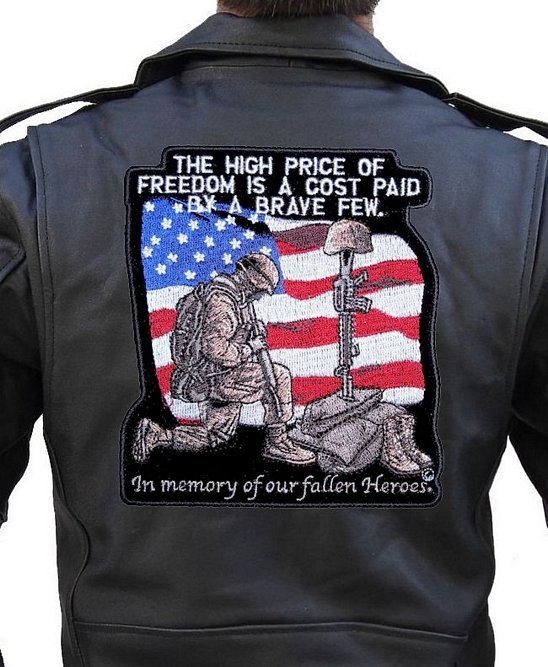 I’m happy and proud to be able to offer this great looking and unique biker patch. It features an American flag in the background with a kneeling soldier and the words “The high price of freedom is a cost paid by a brave few. In memory of our fallen heroes. Can be sewn or ironed on. Great for leather or textile jackets, vest, hats, caps, whatever you can think of. I have this in two sizes: