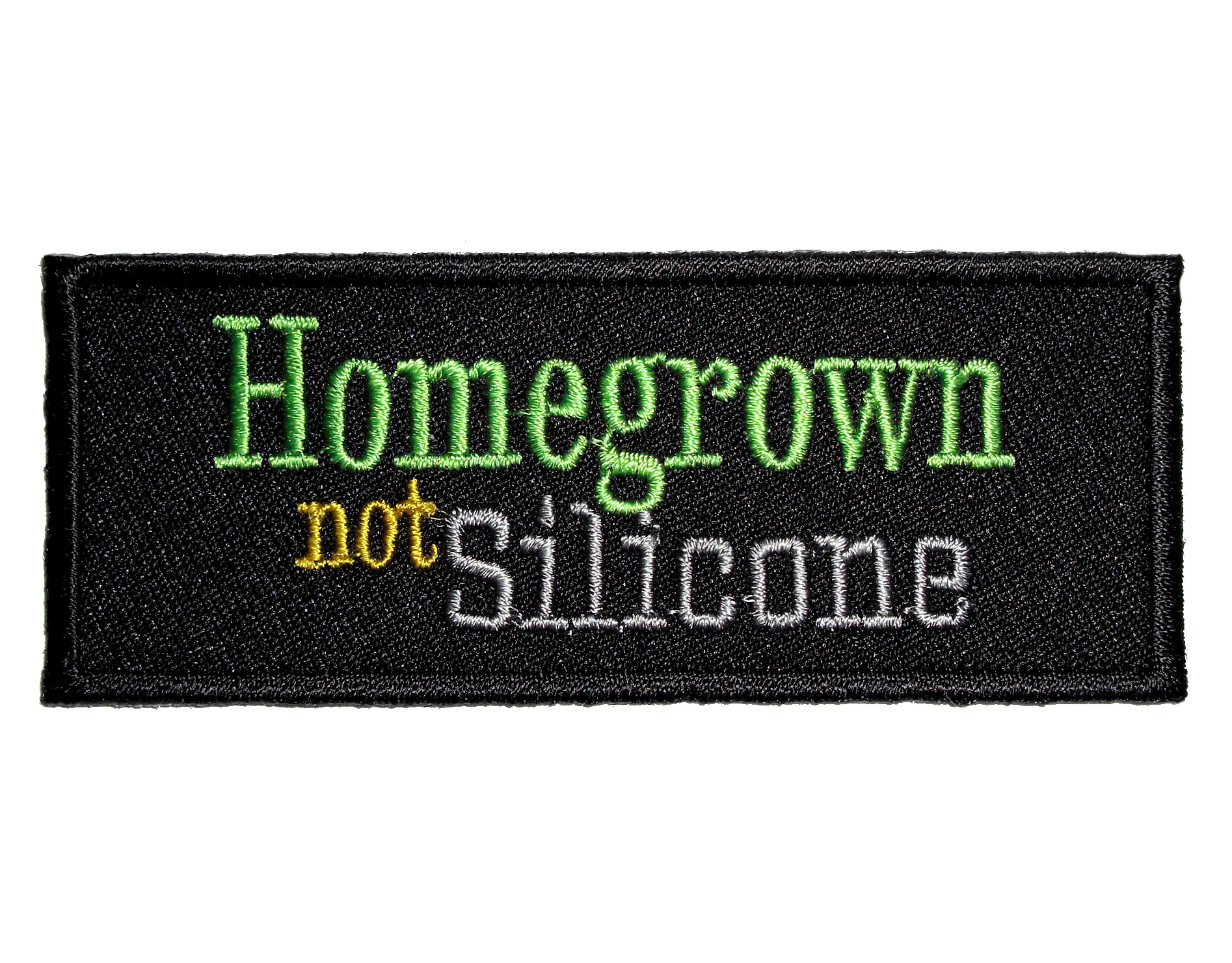 This sexy looking lady biker patch is top quality made. Features the words “Homegrown not Silicone” in neon green, yellow and gray text on a black background. Can be sewn or ironed on. Great for leather or textile jackets, vest, hats, caps, whatever you can think of. Measures 3.5 inches wide by 1.25 inches high. A very sexy lady biker patch for a vest or jacket.