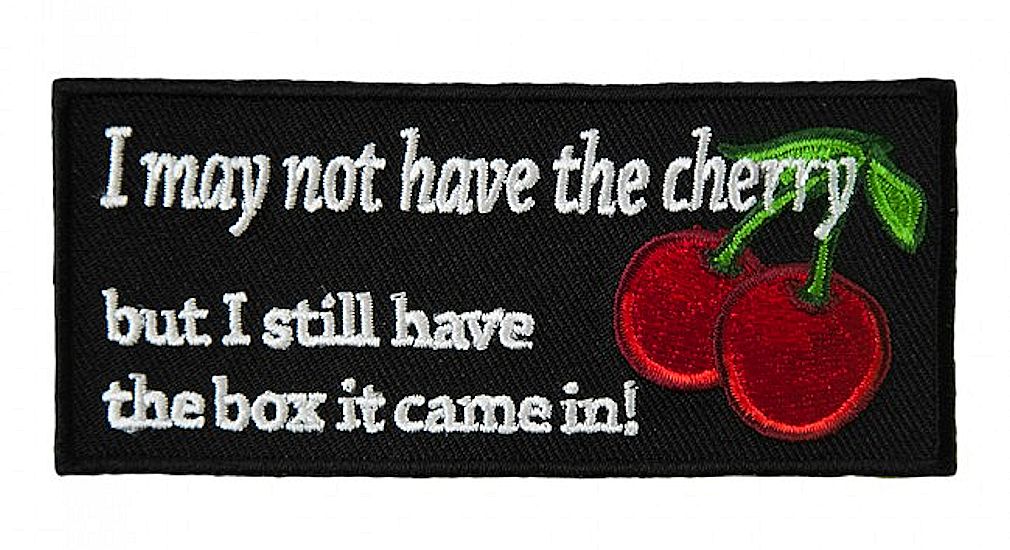 This cool looking biker patch is top quality made and one of my latest designs. It features “I May Not Have The Cherry But I Still Have The Box It Came In!” in white text with red cherries on a black background. Can be sewn or ironed on. Great for leather or textile jackets, vest, hats, caps, whatever you can think of. Measures 4 inches wide by 1.75 inches high. A great cool looking patch. I have many others too, check out my other patches.