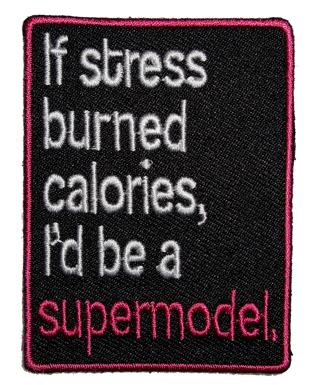 This biker patch is top quality made. It features a really cool looking If Stress Burned Calories I’d Be A Supermodel patch. Can be sewn or ironed on. Great for leather or textile jackets, vest, hats, caps, whatever you can think of. Measures 2 inches wide by 2.5 inches high.