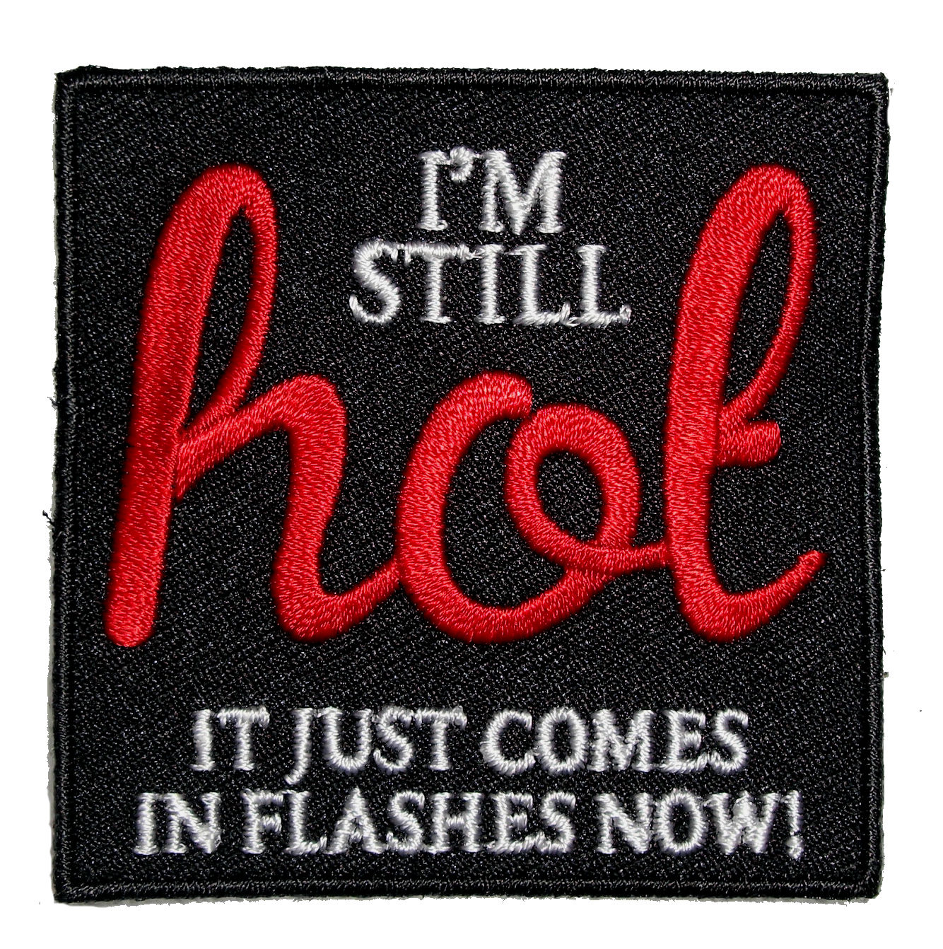 This biker patch is top quality made. It features a really cool looking I’m Still HOT It Just Comes In Flashes Now! patch. Can be sewn or ironed on. Great for leather or textile jackets, vest, hats, caps, whatever you can think of. Measures 2.25 inches wide by 2.25 inches high.