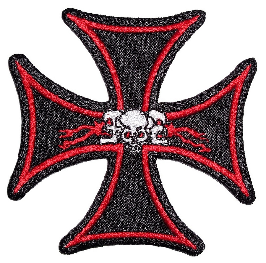 This cool looking biker patch is top quality made. Features a black iron cross with red borders and 3 white skulls in the center with red blood. Has lots of detail. Can be sewn or ironed on. Great for leather or textile jackets, vest, hats, caps, whatever you can think of. Measures 3 inches wide by 3 inches high. A great looking biker patch.