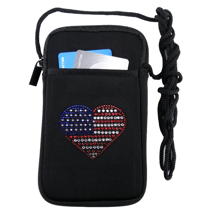 Ladies unique wearable smart phone and credit card holder case with beautiful rhinestone American flag heart design!