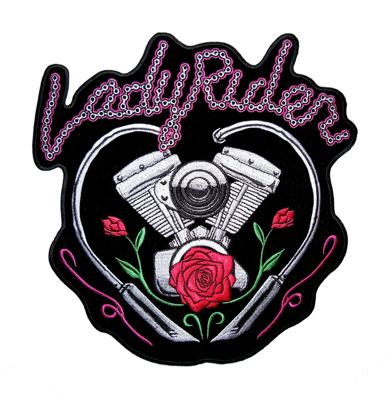 This is a great looking and unique patch. It features “Lady Rider” in a purple and bike chain style at the top, motorcycle engine and roses inside a heart. It is a very beautiful patch with lots of detail. A great patch for Ladies.