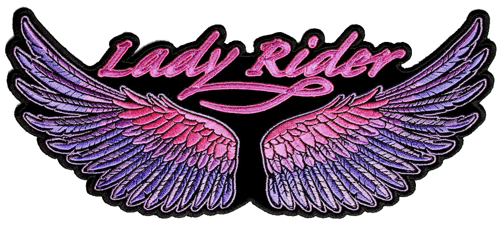This beautiful looking lady biker patch is top quality made. It features a beautiful pair of pink and purple angel wings and “Lady Rider” in pink at the top. The colors are bright with lots of details. Can be sewn or ironed on. Measures 10 inches wide by 4.5 inches high for the back of a jacket or vest. A beautiful ladies patch.