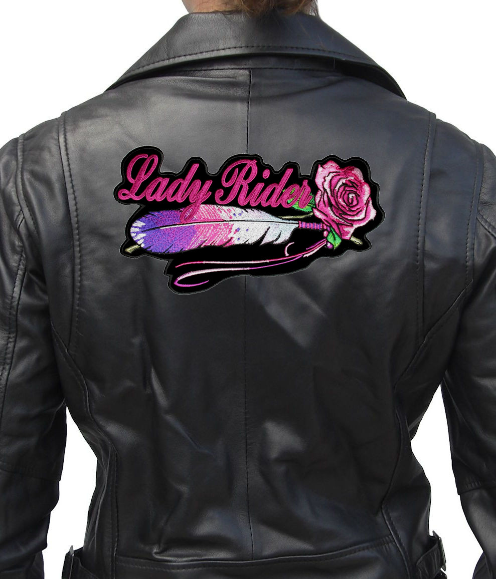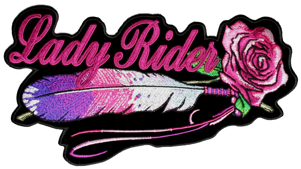 This beautiful looking lady biker patch is top quality made and comes in two sizes. It features a beautiful pink rose with a white, pink and purple feather hanging down and “Lady Rider” in pink to the left. The colors are bright with lots of details. Can be sewn or ironed on. I have this in two sizes: