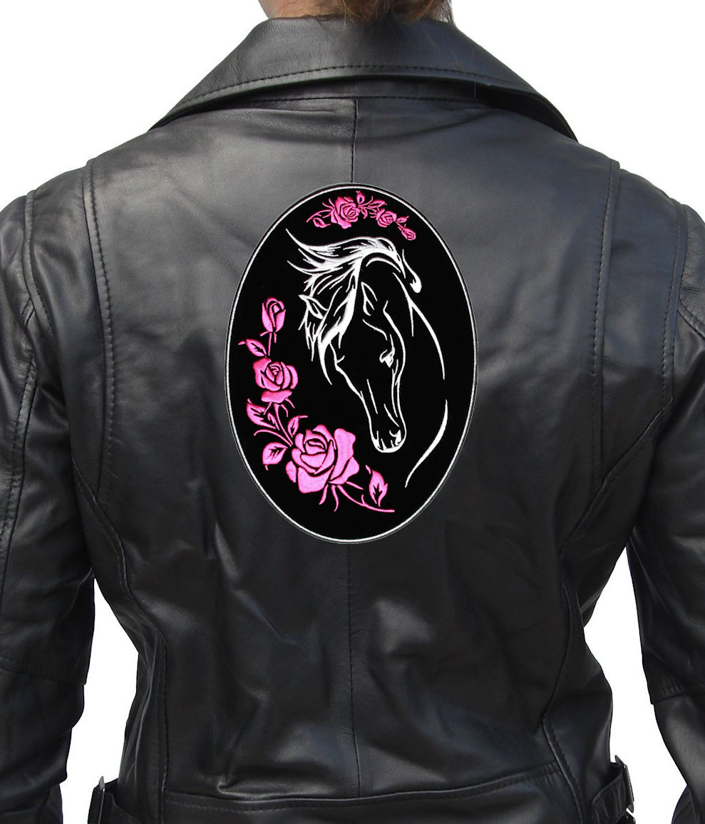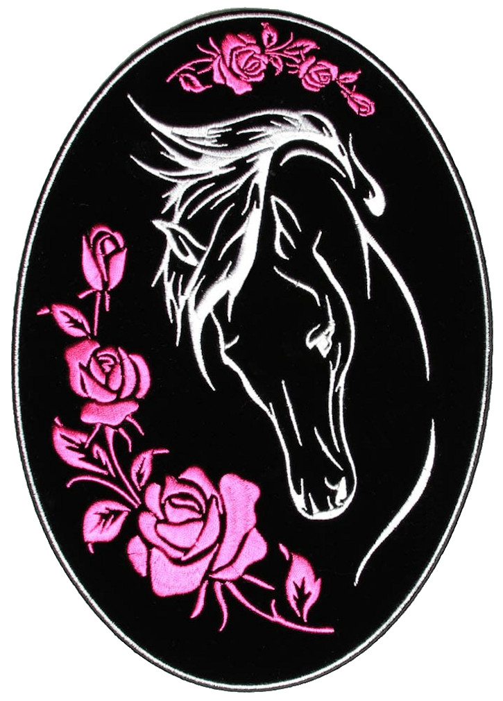 This beautiful looking lady biker patch is top quality made and comes in two sizes. It features a beautiful white horses head silhouette with pink roses and a black background on an oval patch. The colors are bright with lots of details. Can be sewn or ironed on. I have this in two sizes: