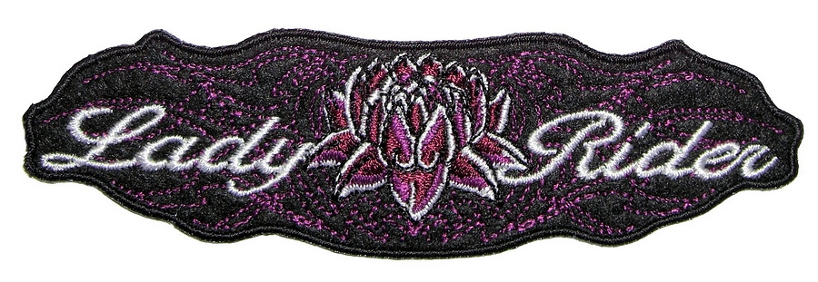 This sexy looking lady biker patch is top quality made. Features a purple flower in the center with purple flames and the words “Lady Rider” in white. Can be sewn or ironed on. Great for leather or textile jackets, vest, hats, caps, whatever you can think of. Measures 4 1/2 inches wide by 1 inch high. A very pretty lady biker patch for a vest or jacket.