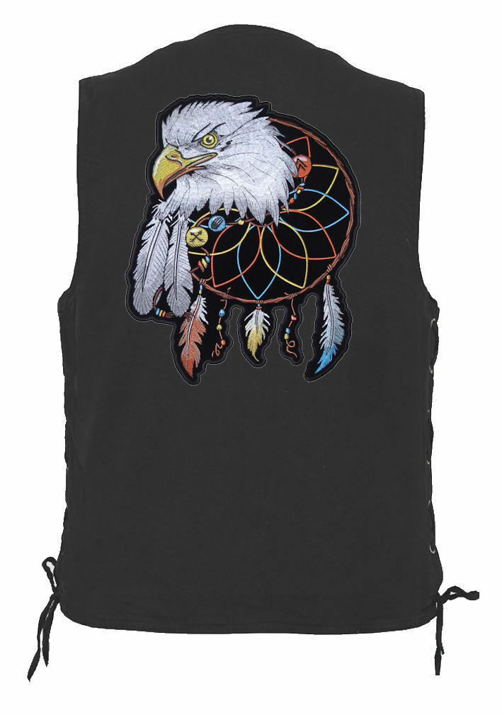 This buy it nowauction is for a beautiful biker patch. I t features a Native American eagle design . It is a large patch, measuring 9 inches wide by 12 inches high with lots of detail.