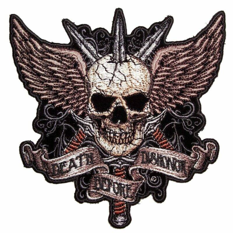 This buy it nowauction is for a beautiful biker patch. I’m happy and proud to be able to offer this great looking and unique biker patch. Very large, it features a skull with 3 swords through it and wings, with “Death Before Dishonor” below it . It is a very large patch, covering most of the back of a jacket with lots of detail.