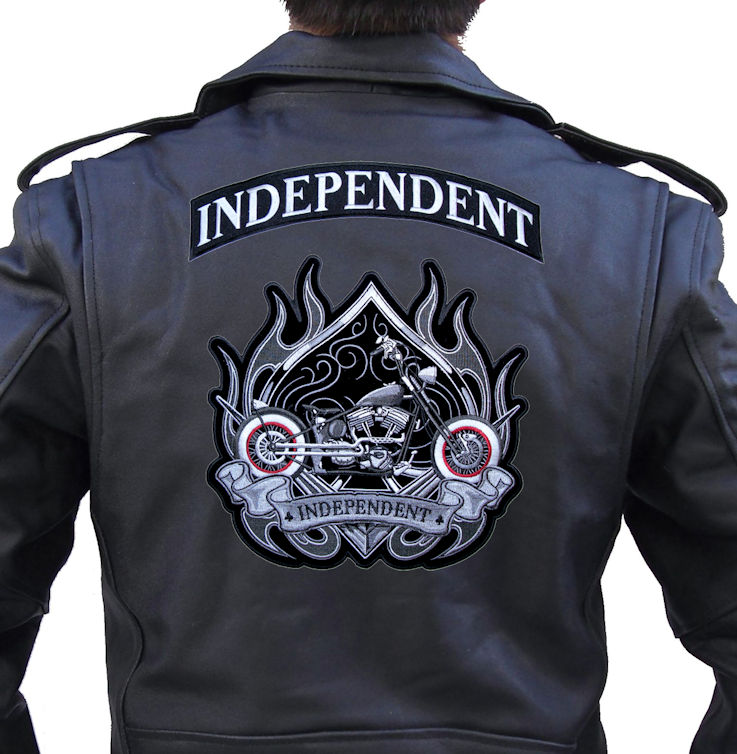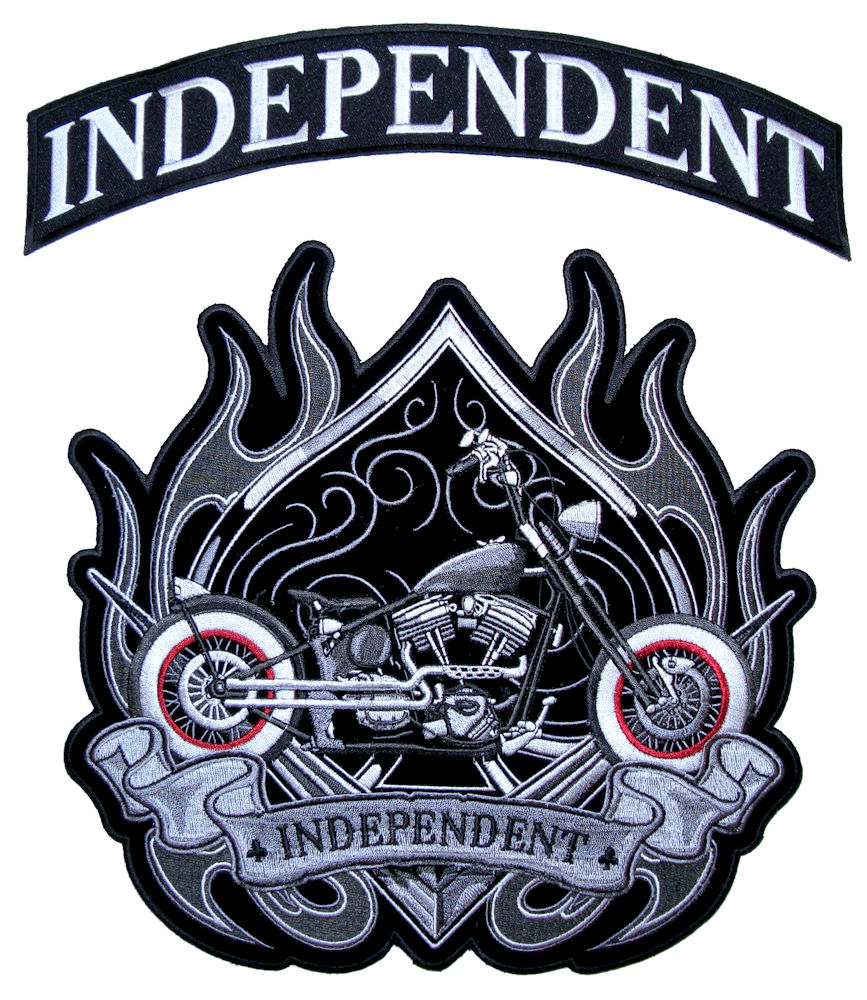 This is a cool 2 pc large Independent rocker patch set. It features a large classic motorcycle with red rims, the ace of spades in the background with flames and the word INDEPENDENT on the silver lower banner. Above it is an INDEPENDENT rocker. Can be sewn or ironed on. Main patch is 11 inches wide by 10.5 inches high. Rocker patch is 12 inches wide by 3.5 inches high. A great looking 2 pc set for the back of a jacket or vest.