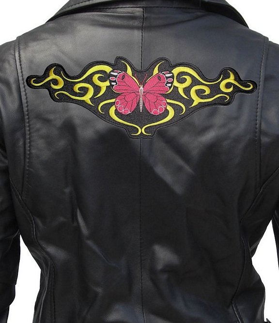 This beautiful looking lady biker patch is top quality made. Features a pretty red butterfly in the center with yellow tribal designs around it. Can be sewn or ironed on. Great for leather or textile jackets, vest, hats, caps, whatever you can think of. Measures a big 12 inches wide by 4 inches high. A very pretty lady biker patch for a vest or jacket, large size so it will look great on the back of a jacket.