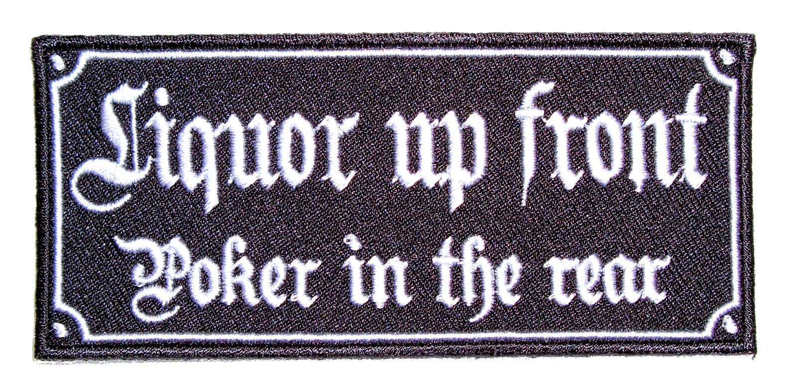 This cool looking biker patch is top quality made and one of my latest designs. It features “Liquor up front poker in the rear” in white old style text on a black background. Can be sewn or ironed on. Great for leather or textile jackets, vest, hats, caps, whatever you can think of. Measures 4 inches wide by 1.75 inches high. A great cool looking patch. I have many others too, check out my other patches.