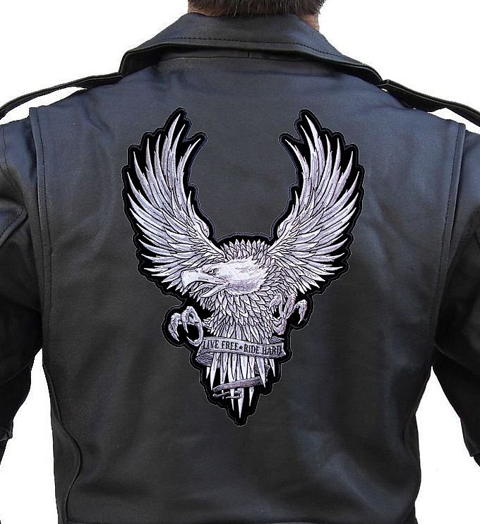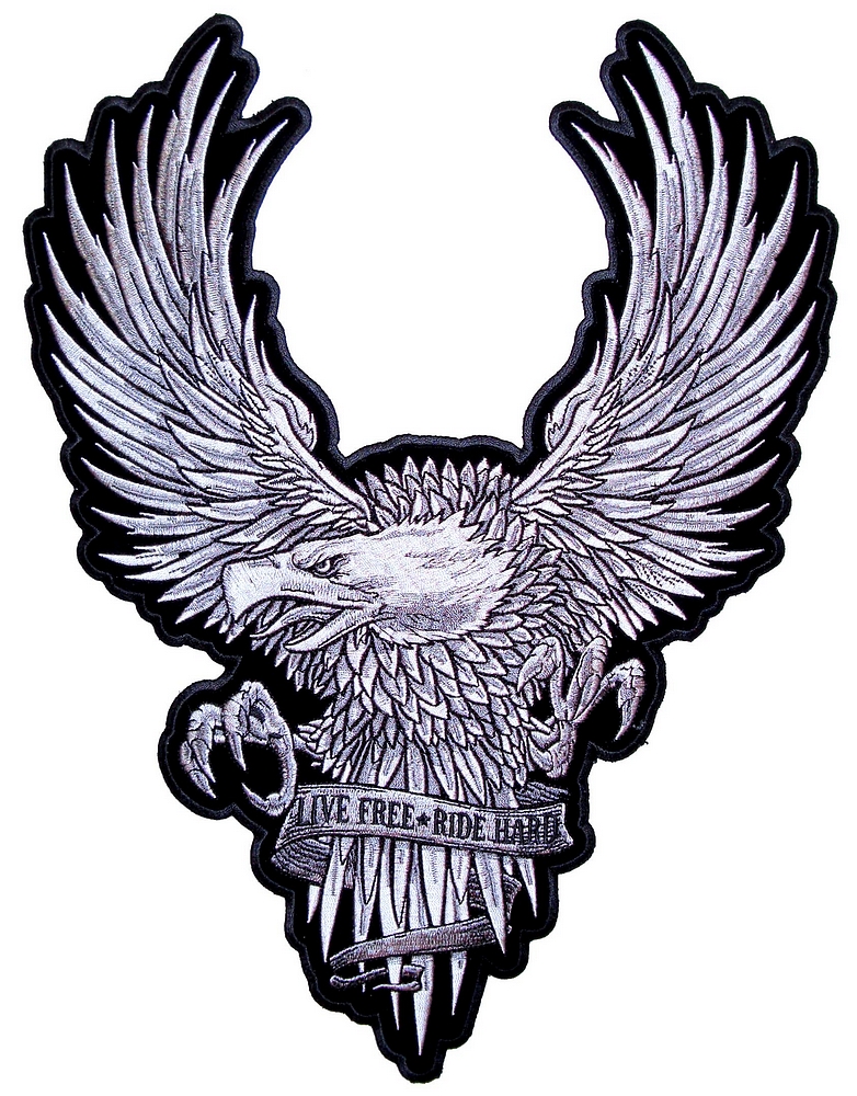 This is one of my very latest biker patches. It features a mean looking silver colored American bald eagle with wings spread and talons out. Below it on a banner is “LIVE FREE RIDE HARD”. It is a great patch with lots of detail. Can be sewn or ironed on. Great for leather or textile jackets, vest, hats, caps, whatever you can think of. I have this in two sizes: