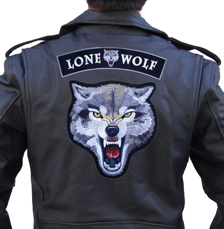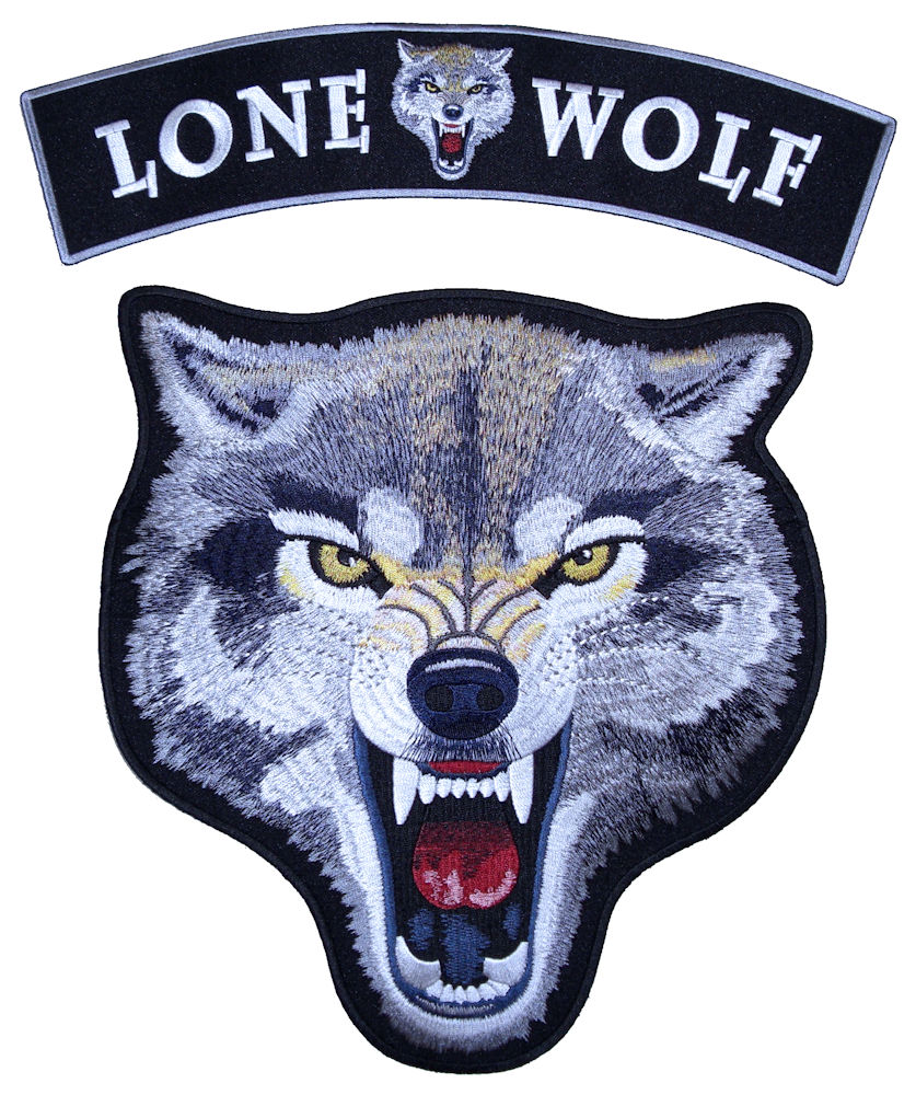 This is a cool 2 pc large lone wolf rocker patch set. It features a large brown and gray growling wolf with yellow eyes. At the top is a matching LONE WOLF rocker patch with a smaller wolf in the center. Can be sewn or ironed on. Main wolf patch is 10 inches wide by 10.75 inches high. Rocker patch is 12 inches wide by 3.5 inches high. A great looking 2 pc set for the back of a jacket or vest.