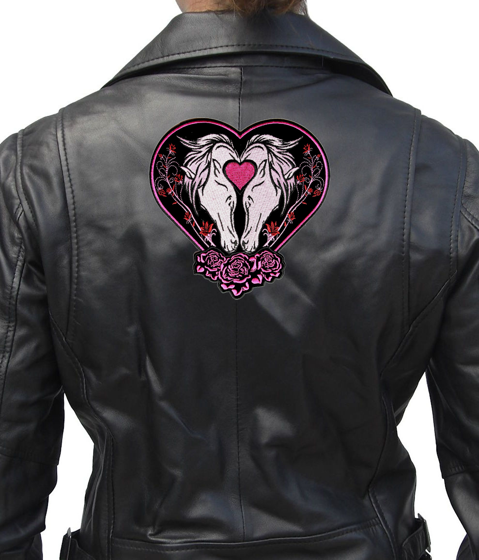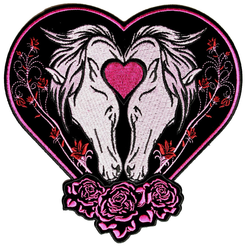 This beautiful looking lady biker patch is top quality made and comes in two sizes. It features two beautiful horses with a pink heart between them, pink roses at bottom and around them, all inside a heart shaped design and black background. The colors are bright with lots of details. Can be sewn or ironed on. I have this in two sizes: