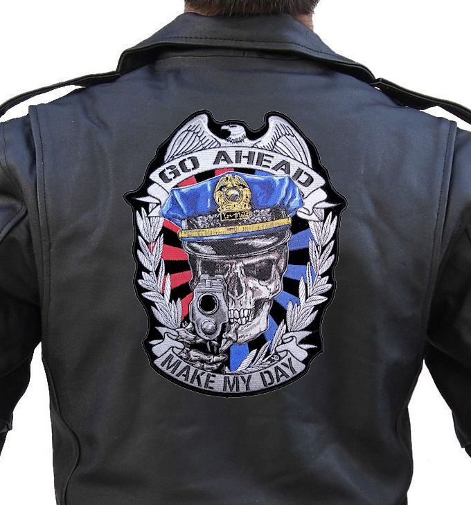 I’m happy and proud to be able to offer this great looking and unique biker patch. It features a cop skull wearing a police officer hat pointing a pistol right at you and the words “GO AHEAD MAKE MY DAY” around it. The patch is in the shape of a police badge. It is a great patch with lots of detail. Can be sewn or ironed on. Great for leather or textile jackets, vest, hats, caps, whatever you can think of. I have this in three sizes: