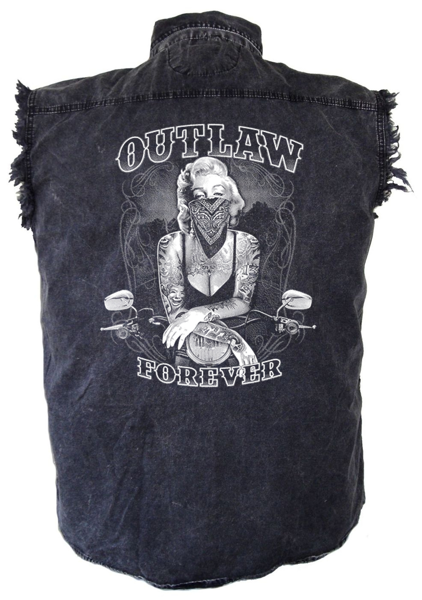This buy it nowauction is for a brand new men’s charcoal color denim sleeveless biker shirt. This high quality denim shirt has been acid washed to give it a cool soft feel and worn look plus it resist shrinking. It is a charcoal color, which is black with slightly faded or worn looking areas, no two shirts are alike. It has a button up front, button down collar and two button chest pockets. The sleeves are cutoff leaving the frayed ends hanging out in classic biker style.